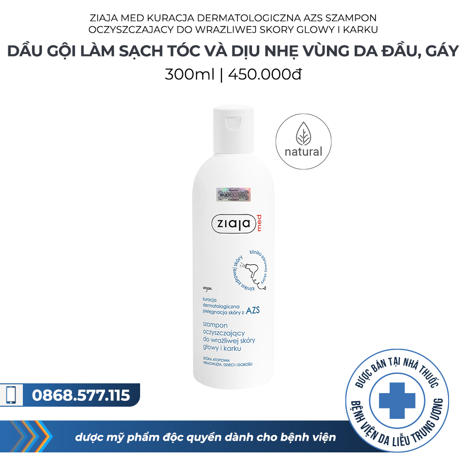 DẦU GỘI LÀM SẠCH TÓC VÀ DỊU NHẸ VÙNG DA ĐẦU, GÁY Ziaja Med Kuracja Dermatologiczna Pielegnacja skory z AZS Szampon Oczyszczajacy Do Wrazliwej Skory Glowy i Karku |